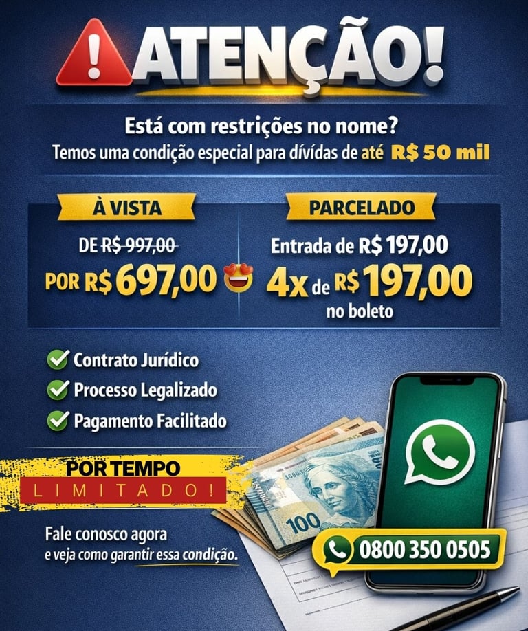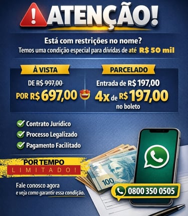 Você não aguenta mais ter o CRÉDITO NEGADO por causa dos apontamentos negativos, score ou rating baixo. Olhar todos os dias com frustração de apresentar seu CPF ou CNPJ em qualquer lugar pois sabe que vai ser exposto seus apontamentos negativos.